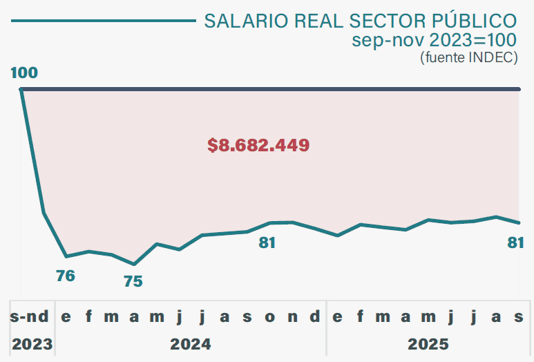 "El salario estatal quedó 19% por debajo del nivel de inicios de mandato y lleva un año estancado. Cada estatal perdió 8,7 millones de pesos de forma acumulada desde que gobierna Milei", calcula el informe.