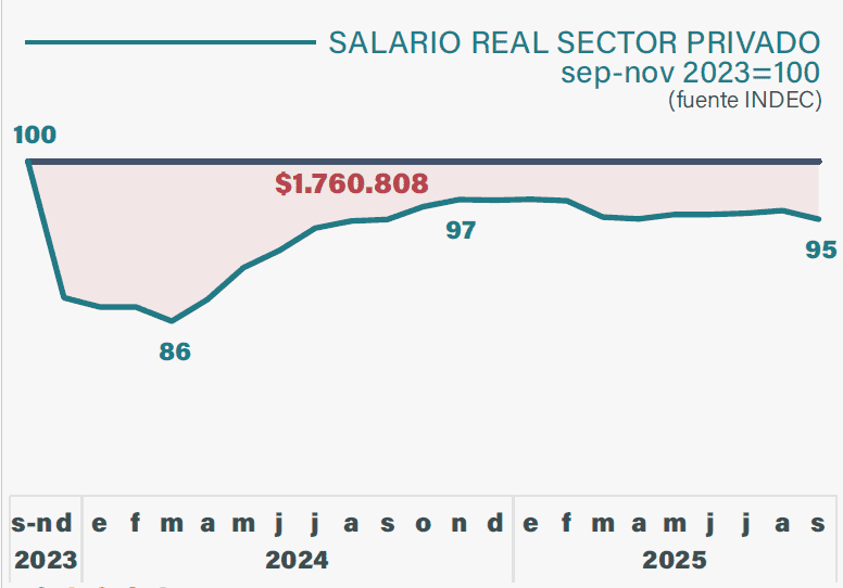 En cuanto al salario real en el sector privado, "cayó en el último mes y quedó 5 puntos por debajo del nivel que tenía al asumir Milei" y "cada trabajador acumula una pérdida de 1,8 millones de pesos".