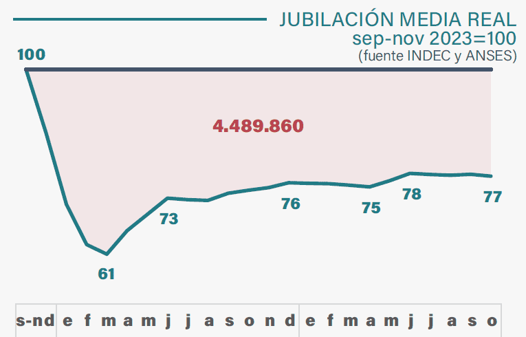Algo similar ocurre con el poder de compra de las jubilaciones: "Está 23% por debajo de 2023. Cada jubilado o jubilada acumula, en promedio, una pérdida de 4,5 millones de pesos. Se trata del sector social más castigado por las políticas del gobierno". El uso de la palabra castigo no parece casual: se extiende también a nivel físico contra quienes se manifiestan los miércoles para reclamar por sus haberes ajustados.