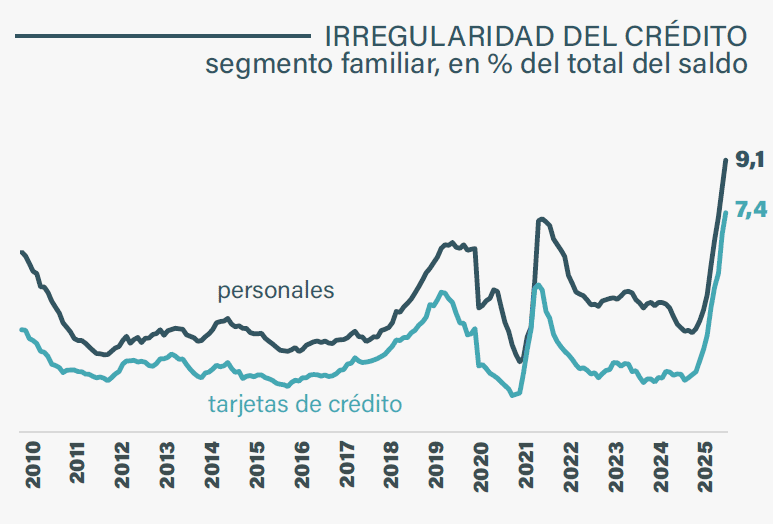 "El endeudamiento de las familias, que no alcanzó para mantener los niveles de consumo de los años previos, está en su punto máximo con serios problemas de irregularidad. Los problemas de morosidad se incrementaron a niveles inéditos", tanto en tarjetas como créditos personales, añade el trabajo de Mate.