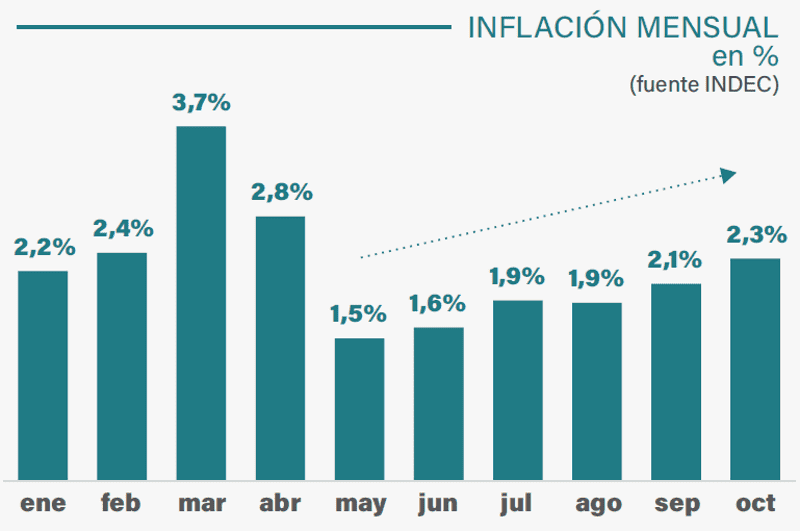 "El 2,3% fue la inflación mensual en octubre, máximo registro en seis meses. El gobierno impuso un enorme sacrificio a la población con la excusa de terminar con este problema, pero el problema persiste mientras se pierden empleos, ingresos y derechos", señala el equipo de economistas locales.