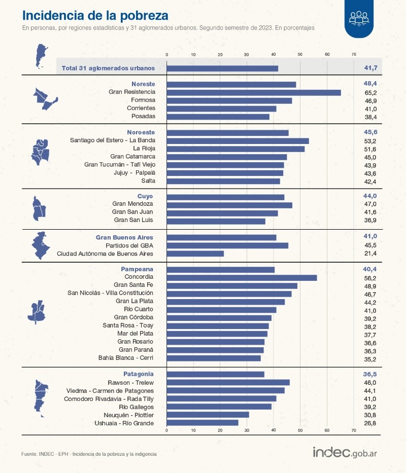 Las mayores incidencias de la pobreza en personas se observaron en las regiones Noreste (NEA), con un 48,4%; y Noroeste (NOA), con 45,6%. Las menores, por su parte, se registraron en las regiones Patagonia (36,5%) y Pampeana (40,4%).