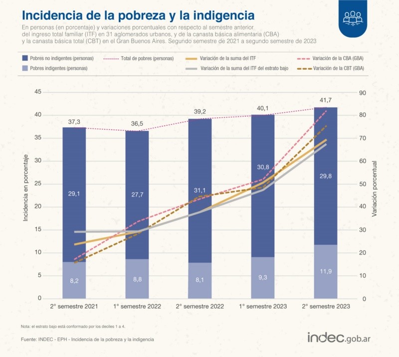 El nivel de pobreza en Argentina llegó al 41,7% en el segundo semestre de 2023, lo que equivale a un universo de 12,3 millones de personas, subiendo así 1,6 puntos porcentuales con respecto al primer semestre del mismo año, según informó este miércoles el Instituto Nacional de Estadística y Censos (Indec).