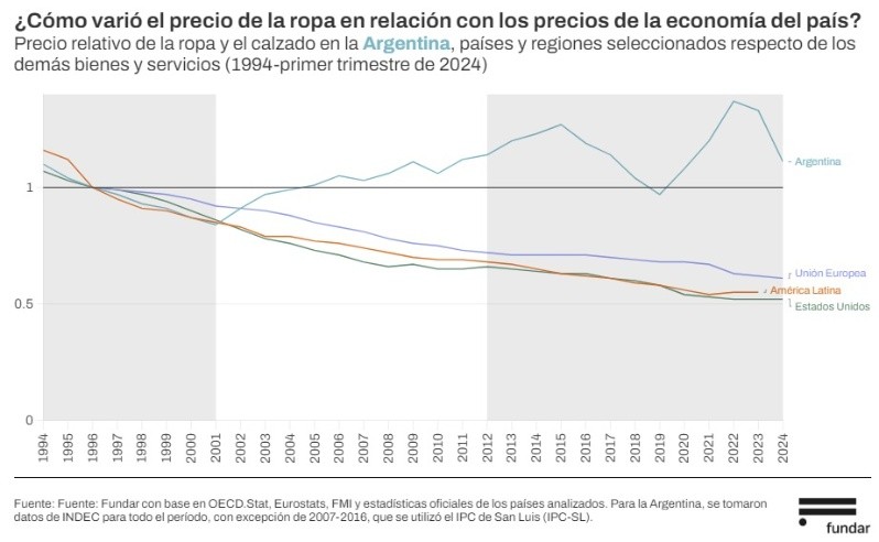 El precio de la ropa en Argentina aumentó un 32% por encima de la inflación general durante las últimas dos décadas, desde la salida de la convertibilidad, mientras que en el resto del mundo el comportamiento de los precios fue excatamente el opuesto, dado que la indumentaria se abarató en la misma proporción que otros bienes y servicios de la economía.