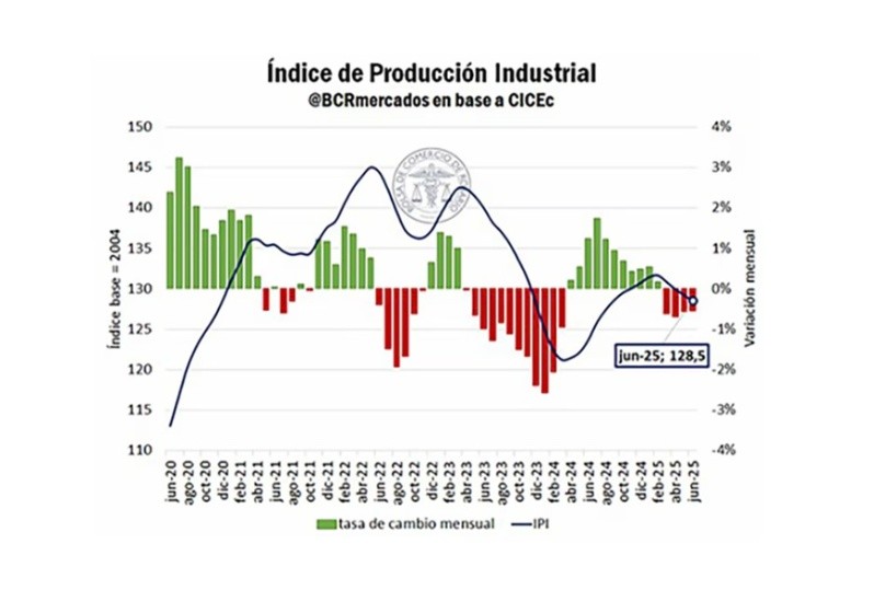 Según el CICEc, el freno en la recuperación industrial se da en un marco macroeconómico más ordenado, con cuentas públicas en mejor equilibrio y una desinflación en curso. No obstante, la volatilidad en las tasas de interés y el tipo de cambio afectó a la economía real y, en particular, a la industria manufacturera. El estudio apunta directamente al nuevo régimen cambiario implementado en abril: “El esquema de flotación entre bandas supuso un aumento en el tipo de cambio que encareció el costo de los insumos, lo cual se tradujo en un freno en los niveles de actividad industrial”. De los 16 sectores que componen el Índice de Producción Industrial Manufacturero (Ipim), 12 registraron caídas entre marzo y junio. En ese sentido, los más afectados fueron: En contraste, algunos sectores mostraron variaciones positivas, como minerales no metálicos (+6,6%), refinación de petróleo (+1,6%) y productos de caucho y plástico (+0,6%). El sector de alimentos y bebidas, con un peso del 25% en el índice general, fue el que más aportó al retroceso. La caída del 0,7% en esta rama productiva se explica principalmente por la menor elaboración de gaseosas, aguas, sodas, cervezas, jugos, sidras y bebidas espirituosas. Esa merma no pudo ser compensada por los aumentos en la molienda de oleaginosas, la producción de azúcar ni la de confitería y chocolates.Sectores industriales más afectados
