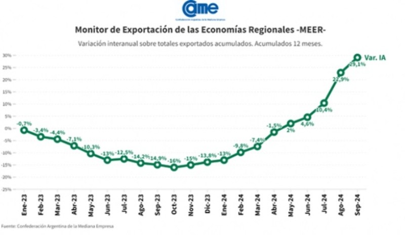 Las ventas al exterior de productos y materias primas de las distintas provincias del país tuvieron un rendimiento positivo durante septiembre pasado, habiendo registrado un incremento del 29,1% en dólares y 26,5% en toneladas, según las mediciones del Monitor de Exportaciones de las Economías Regionales elaborado por la Confederación Argentinas de la Mediana Empresa (Came).