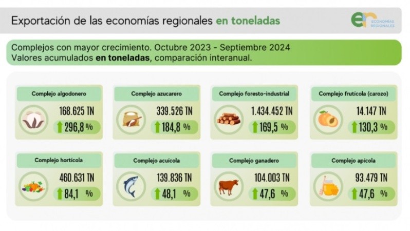 Con este incremento, las exportaciones regionales alcanzaron los USD 8.649 millones exportados en el período octubre 2023-septiembre 2024, habiendo importado USD 791 millones, lo que arroja un superávit comercial de USD 7.858 millones.
