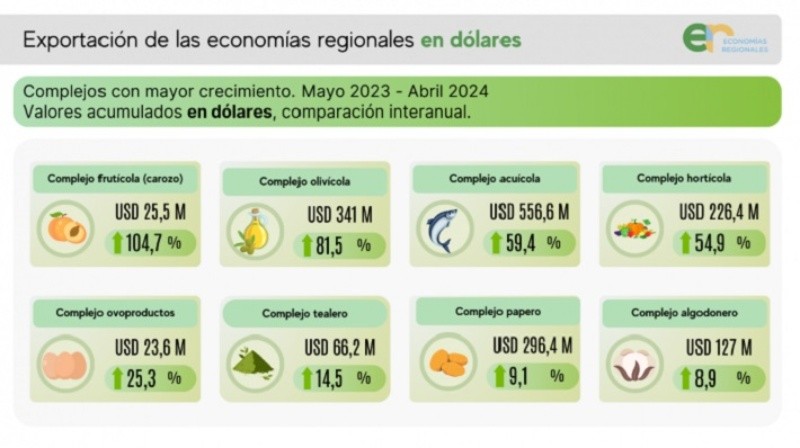 Complejo frutícola (carozo) Durante el período de mayo de 2023 a abril de 2024, el complejo frutícola de carozo, que incluye duraznos, ciruelas, cerezas y otros, registró un gran crecimiento en sus exportaciones. En términos de valor, las exportaciones alcanzaron un total de USD 25,5 millones, representando un aumento del 104,7% en comparación con el mismo período del año anterior. Complejo olivícola En segundo lugar, se destaca el complejo olivícola, que incluye aceitunas de mesa y para aceite, aceite de oliva y otros derivados de las aceitunas. Durante los últimos doce meses, este complejo registró exportaciones por un total de USD 341 millones, lo que representa un crecimiento del 81,5%. Complejo frutícola (carozo) Al igual que en el análisis por montos exportados, el complejo que abarca duraznos, ciruelas, cerezas y otros frutos con carozo, registró un notable aumento en el volumen exportado, alcanzando las 13.647 toneladas durante el período mayo 2023 a abril 2024, lo que representa un crecimiento del 124% respecto al período anterior. El complejo tuvo un crecimiento exponencial en los últimos 12 meses, marcando aumentos por encima del 100% tanto en toneladas como en USD exportados. Complejo foresto-industrial El segundo complejo con mayor crecimiento en volumen corresponde al foresto-industrial, incluyendo desde madera en bruto hasta pulpa y pasta de papel, que exportaron un total de 1.055.387 toneladas durante el período mayo 2023 a abril 2024, lo que representa un incremento del 94,9% en comparación con el mismo período del año anterior (2022-2023). Por otra parte, el valor total de las exportaciones alcanzó los USD 380,1 millones, reflejando un leve aumento del 5,1% en relación con el período anterior; aunque al mismo tiempo los precios de exportación experimentaron una disminución del 46% en su valor por tonelada (mayor caída en este aspecto), estableciendo un valor promedio de USD 360. Buenos Aires y Caba Es la principal región exportadora del país, representando un 50,9% del total exportado en dólares por las economías regionales. En el período analizado, Buenos Aires y Caba tuvieron ingresos por exportación de USD 3.782,8 millones, lo que representa una disminución interanual del 0,3% en dólares exportados. El complejo más representativo en sus exportaciones fue el porcino y caprino, habiendo comercializado USD 431,8 millones, es decir, un 11,4% del total exportado por la región. Patagonia Considerada como la región compuesta por las provincias de Chubut, La Pampa, Neuquén, Río Negro, Santa Cruz y Tierra del Fuego e Islas del Atlántico Sur, la Patagonia exportó un total de USD 569,6 millones, destacando a la provincia de Río Negro, con un total exportado de USD 333,4 millones. Se observa un crecimiento del 15%, respecto al período anterior y, además, continúa siendo la región con mayor crecimiento en este aspecto. En cuanto al complejo productivo más representativo de la región, con USD 301 millones exportados, el complejo frutícola (manzanas, peras y membrillos) explica un 52,8% de los dólares obtenidos por las ventas patagónicas al exterior.