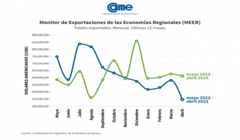 El último informe del Monitor de Exportaciones de las Economías Regionales (MEER), elaborado por la Confederación Argentina de la Mediana Empresa (Came), mostró que abril terminó con una caída en las exportaciones de las economías regionales del 1,5% en dólares, y con un crecimiento del 2,8% en toneladas. Esto representa una baja interanual de USD 113 millones en el total exportado y un aumento de 175 mil toneladas en el volumen comercializado.