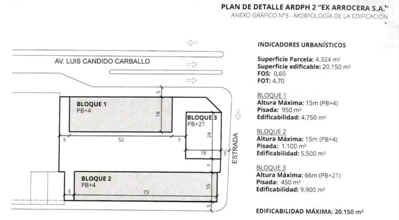 En principio, proyectan un bloque de planta baja más 21 pisos sobre Estrada y luego dos bloques de PB más cuatro pisos sobre Carballo y sobre Don Orione totalizando una construcción a edificar de 20 mil metros cuadrados.