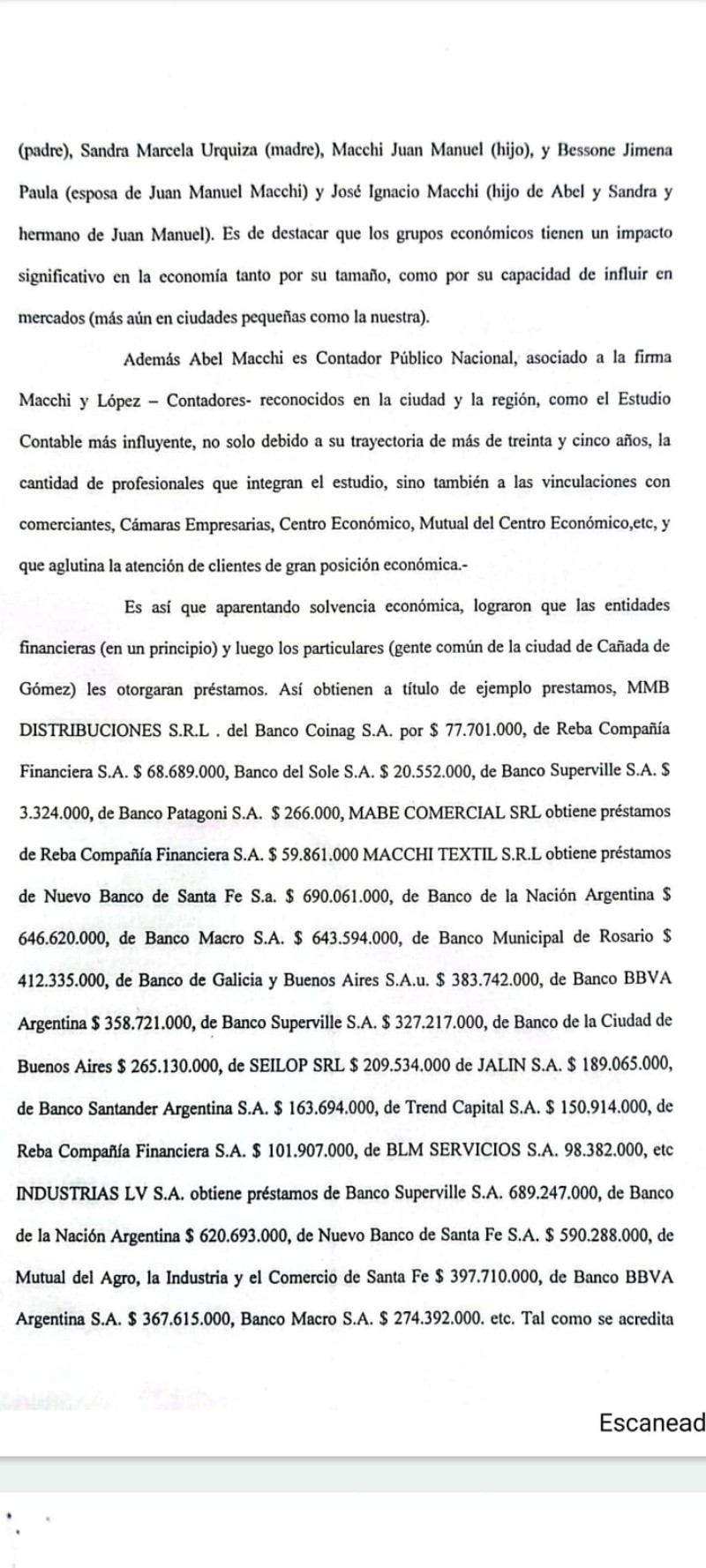 Según los denunciantes, “todos los denunciados, a partir de una empresa de origen, la cual es Macchi Textil SRL, generaron un grupo económico de al menos seis sociedades en la que los integrantes se repetían en su mayoría, para poder aparentar una sobrada solvencia y desarrollo comercial en notable crecimiento, para que con cada una de ellas obtener créditos y préstamos de diferentes entidades (bancos, mutuales, financieras y particulares) con el objetivo de expandirse”.