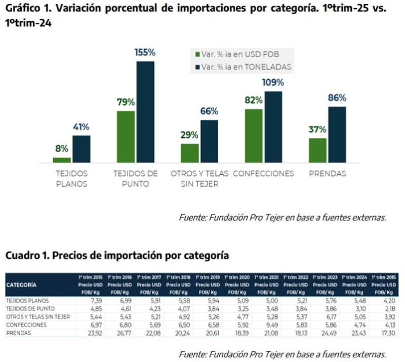 Según un informe publicado por la fundación ProTejer, las importaciones de ropa y textiles del hogar se dispararon un 86% y 109% interanual respectivamente durante el primer trimestre de este año, marcando un “récord histórico”. Esa situación, apuntaron, se explica en parte por una reducción del 26% en el costo del valor promedio por kilo de indumentaria y confecciones en comparación con 2024.