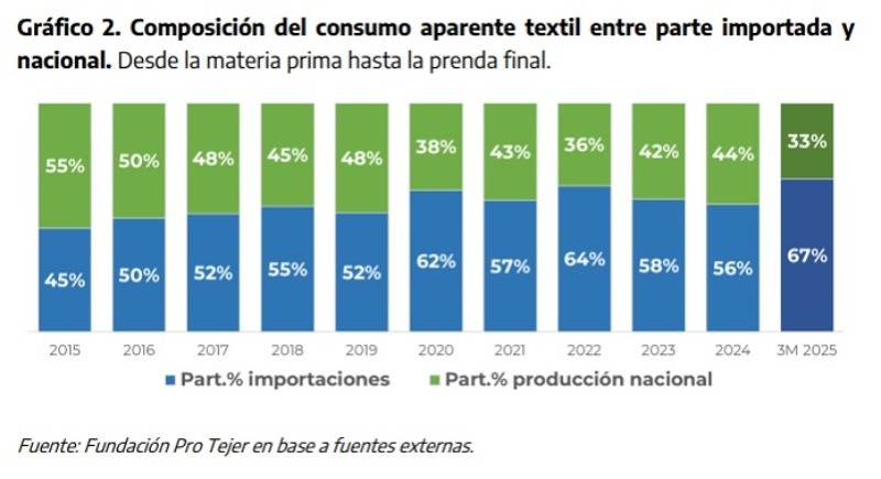 En este contexto, dos tercios de las prendas de vestir que compran los argentinos son importadas, el “share” más elevado desde 2015, cuando la fundación comenzó a recopilar los datos para su serie histórica. Esta situación, advirtieron, deriva en el “cierre de empresas, pérdida de empleo y de eslabones clave dentro de la cadena de valor”.