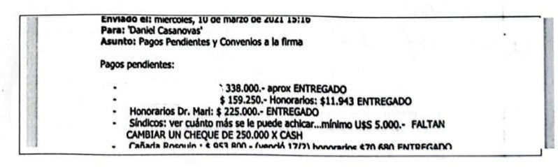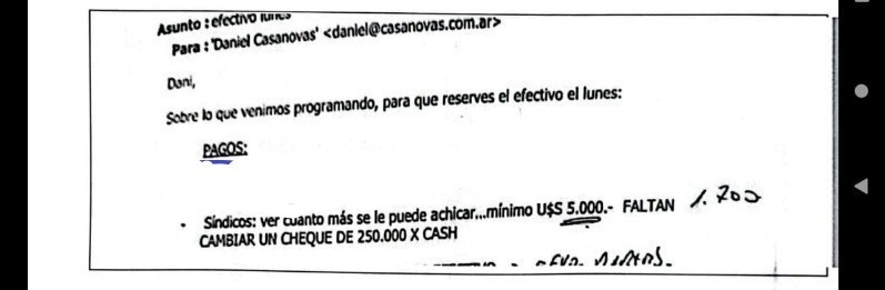 Un correo electrónico que recibió del 10 de marzo que dice en el asunto “Pagos Pendientes” donde entre los pagos apunta: “Síndicos: ver cuánto más se puede achicar…mínimo u$s5.000. Falta cambiar un cheque de $250.000 por cash".