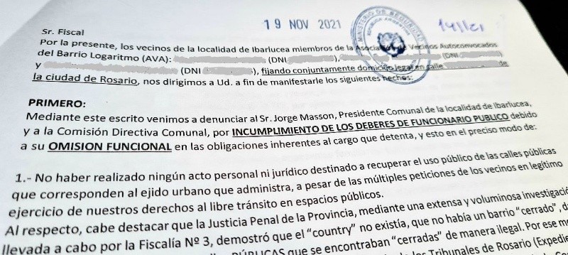 Fue en ese momento en el que a los vecinos les llegó la versión sobre el convenio urbanístico que sustentaba la avanzada en su contra, pero recién el año pasado lograron que alguien les filtre una copia autentica (en un escena digna de película de espías y que involucró un fugaz encuentro en la Plaza Pringles para recibir los papeles). Ya con ese documento en la mano presentaron la denuncia penal en Fiscalía de Rosario acusando a los firmantes de “falsedad ideológica, falsedad material, asociación ilícita, usurpación, cohecho, incumplimiento de los deberes de funcionario público, y defraudación”.