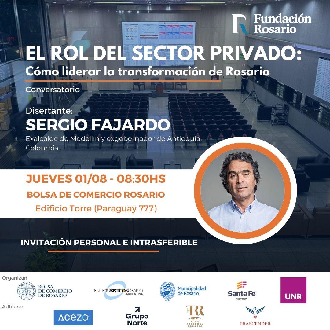 Fajardo estará tres días en Rosario, uno con agenda provincial, otro con agenda municipal y finalmente dará el jueves una charla magistral en la Bolsa de Comercio de Rosario con un título que lo dice todo: "El rol del Sector Privado. Como liderar la transformación de Rosario".