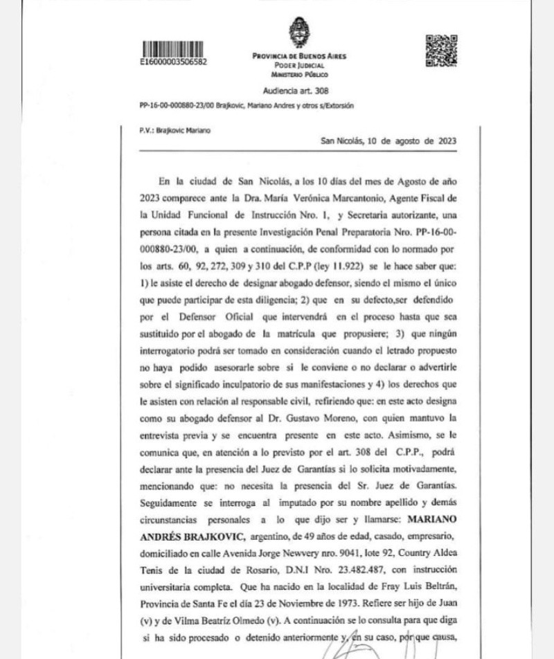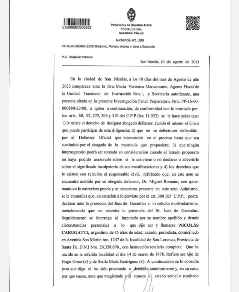 El jueves, Carugati y Brajkovic comparecieron ante la fiscal de San Nicolás, María Verónica Marcantonio, y allí se declararon inocentes. No pasó desapercibido en el tribunal que Brajkovic llegara con un pedido de “eximición de prisión”.