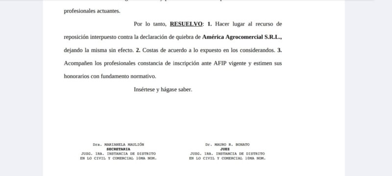 Fue así que el juez Mario Bonato levantó la quiebra, no habiendo muchos precedentes en que se levante quiebras en esa instancia. Y cómo esa semana se vencieron los plazos para apelar y nadie lo hizo, la resolución quedó firme.
