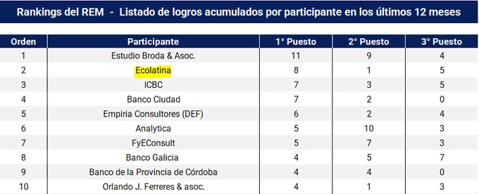 Y a prestarle atención a lo que diga Ecolatina porque en el ranking de consultoras que realiza el Banco Central sobre quienes le pegaron más cerca con sus proyecciones de inflación estuvo en el segundo puesto. Y así quedo el top ten: