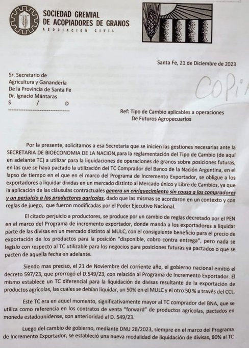 Fue así que la Sociedad Gremial de Acopiadores de Rosario le envió sendas cartas a las autoridades provinciales pidiendo que gestiones ante Nación que los fowards (sobre todo los trigo, que se vencen en enero) se puedan cobrar al dólar exportador y no al oficial, como dicen los contratos.