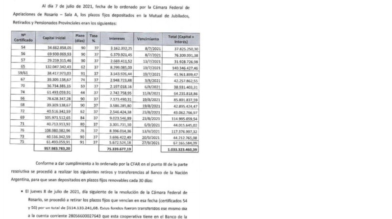 Rosario3 accedió a un informe que hizo Sorrequieta para la jueza Aramberri en la que va detallando cómo a medida de cada vencimiento los depósitos se trasladaban al banco Nación. Para la fecha de la confección, un tercio de los $1.000 millones habían vuelto sanos y salvos al Banco Nación. Al viernes pasado, según confirmó Rosario3 cotejando los certificados de depósitos, ya se devolvieron el 50% al Banco Nación.