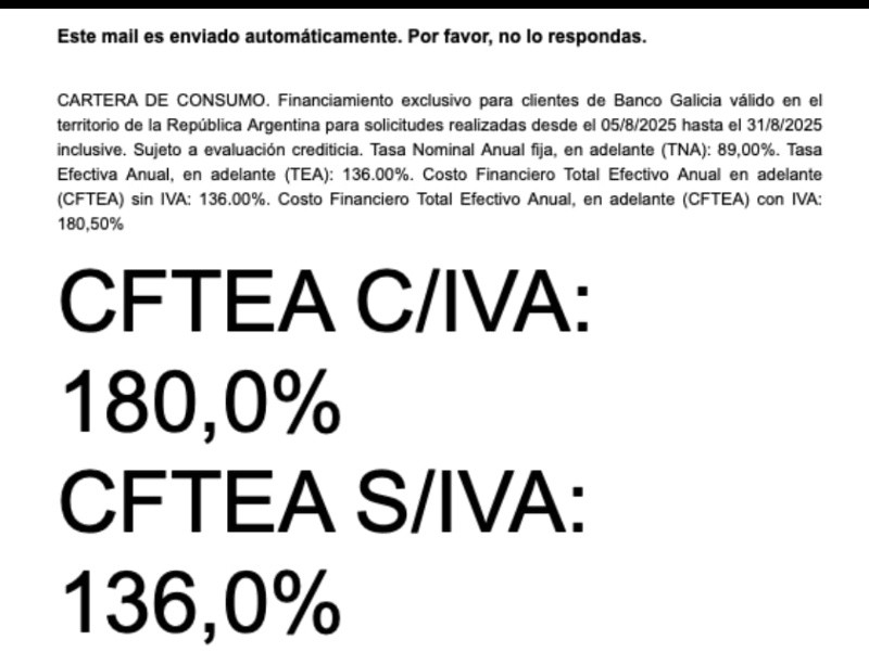- Como paradoja, mientras todo esto ocurre y cientos de dólares y pesos se pierden en las mesas de dinero blue de Rosario, la economía argentina enfrenta una creciente restricción crediticia con un costo financiero que se disparó arrojando cifras irrisorias como la línea de préstamos que promociona, sin ruborizarse, el banco Galicia en esta comunicación a clientes qeu dejamos ahora. Y menos mal que es una "ventaja" para clientes.