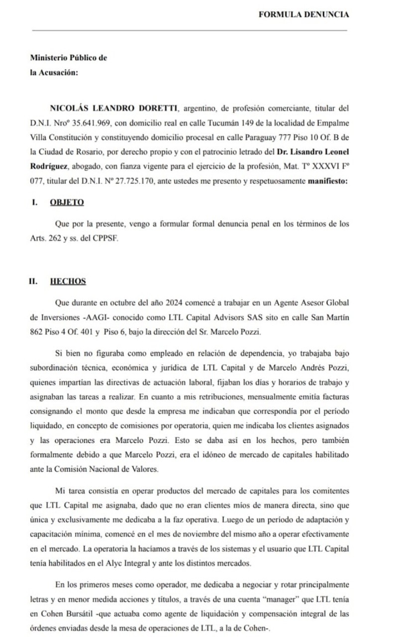Resulta que un joven operador bursátil presentó una denuncia contra la sociedad LTL Capital Advisors SAS, a quien acusa de haberlo manipulado para firmar pagarés por sumas millonarias con el fin de cubrir pérdidas de la empresa. El denunciante comenzó a trabajar en octubre de 2024 en la firma ubicada en San Martín 862 de Rosario.