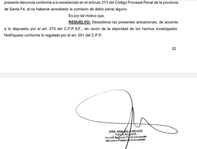 “En virtud de lo expuesto y considerando que nos hallamos frente a un asunto claramente contencioso-administrativo y/o de índole política, ajeno al ámbito penal, y habiendo sido previamente sentado por la justicia civil que el Club Logaritmo Rugby tiene la naturaleza jurídica de un barrio cerrado, privado, country o conjunto inmobiliario, corresponde desestimar la presente denuncia conforme a lo establecido en el artículo 273 del Código Procesal Penal de la provincia de Santa Fe, al no haberse acreditado la comisión de delito penal alguno”, sostiene la fiscal Ana Milicic.