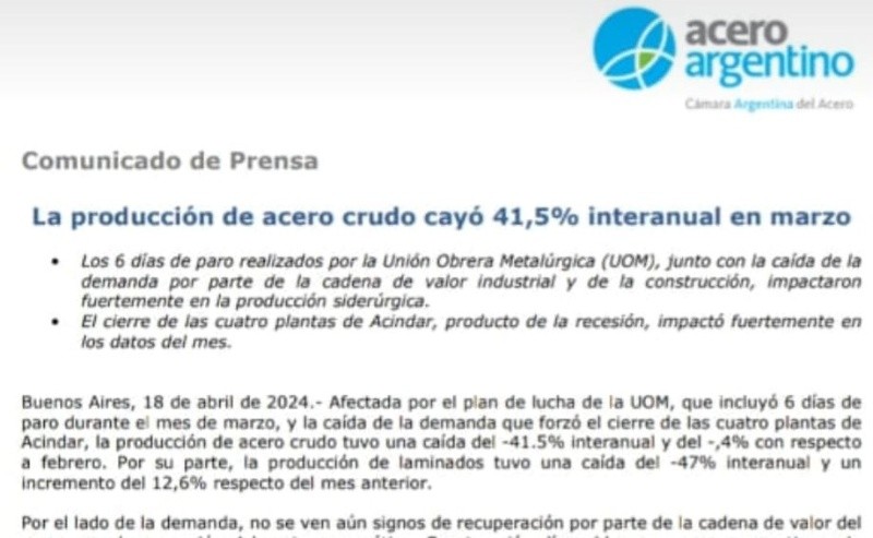 Alacero es la entidad que reúne a todas las acerías de América latina, y esta semana lanzó un comunicado con un dato de terror: es impresionante la caída de la producción de acero en Argentina. Veamos: