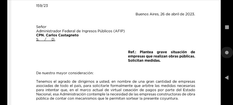 “Le solicitamos formalmente que arbitre medidas necesarias para intentar que en el marco actual de virtual cesación de pagos por parte del Estado nacional, la Afip contemple la necesidad de las empresas constructoras de obra pública de contar con mecanismos que le permitan sortear la coyuntura”, señala el dirigente.