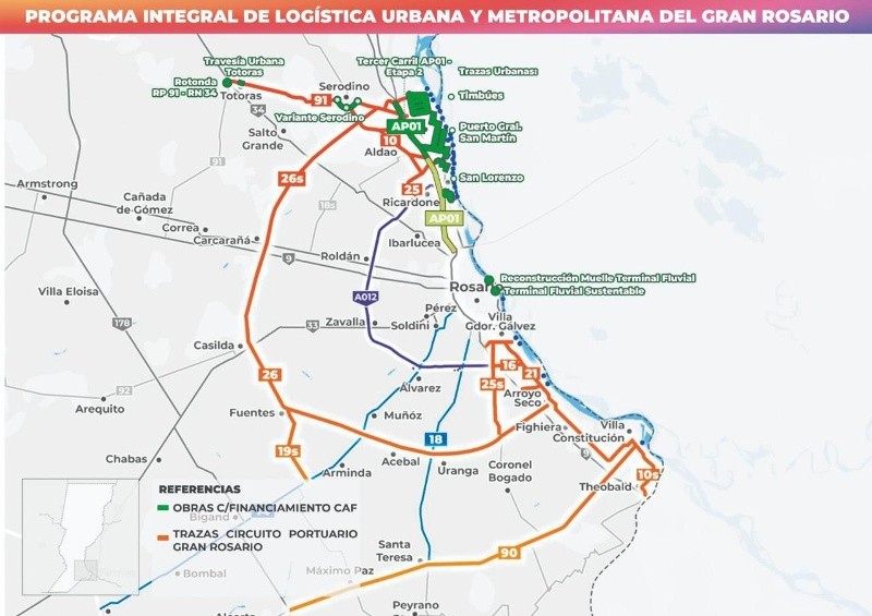 El programa integral de logística urbana y metropolitana apunta a fortalecer la integración del Gran Rosario con su complejo portuario, impulsándolo como nodo estratégico del desarrollo productivo mediante un ambicioso programa de obras de infraestructura logística. Entre ellas se destacan obras como la segunda etapa de la construcción del tercer carril de la autopista, desde San Lorenzo hasta el acceso a la zona portuaria de Timbúes.