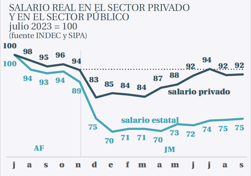 El salario estatal retrocedió aún más: ese mes bajó a 75% y enero de 2024 encontró el piso en 70%.