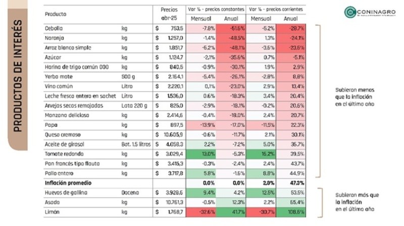 Esta situación, apuntaron, se replica en varias economías regionales que abastecen el mercado interno. “Por poner algunos ejemplos: en el último año la cebolla perdió el 51,6% de su valor real; la naranja, el 48,5%; el arroz, el 48,1%; el azúcar, el 35,6%, y la harina, el 30,1%”, precisaron.