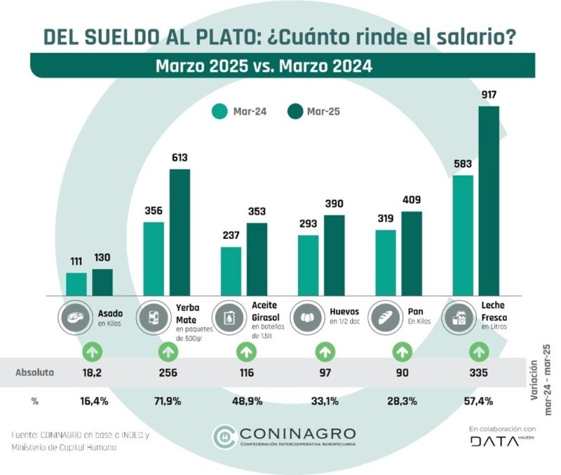 Según apuntan en el informe, el salario medido por Ripte ganó poder de compra frente a seis alimentos básicos que monitorea Coninagro: aceite de girasol, yerba mate, leche, asado, huevo y pan.