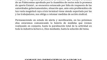 “El proyecto y compromiso del Gobierno Nacional para reorganizar y recuperar la capacidad productiva de SanCor, -que incluyó el armado de un Fideicomiso aprobado por la Asamblea de socios más la promesa de aporte Estatal-, se encuentra estancado por falta de respuesta de las autoridades gubernamentales, situación que, ante esta problemática de tan vasta magnitud cuya crisis terminal viene siendo soportada por las y los trabajadores, nos obliga a retomar medidas de acción sindical”, dice el gremio en un comunicado por el que salió a hacer pública sus gestiones ante el gobierno.