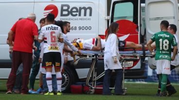 El delantero argentino de Sao Paulo de Brasil, Lucas Pratto, está fuera de peligro tras el choque con su compañero Hernanes, quien le pegó un rodillazo en la cabeza, durante un partido contra Palmeiras en un duelo válido por la 22ª jornada del Campeonato Brasileño de 2017.