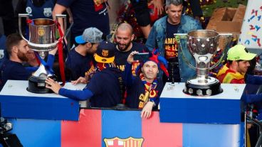El capitán, disfrazado con un sombrero de juglar con los colores azulgranas que pasó por la cabeza de media docena de jugadores en un momento u otro de la fiesta, pone fin a su etapa en el club catalán con 32 títulos, entre ellos nueve Ligas, y este lunes se subía al autobús de los éxitos por última vez.