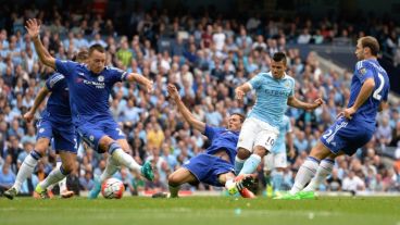 El delantero argentino Sergio Agüero marcó el primer tanto del puntero Manchester City, que goleó este domingo al último campeón, Chelsea, por 3-0 de local en la segunda fecha de la Liga inglesa de la primera división.