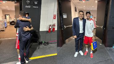 Román y Fideo, que compartieron apenas seis partidos en la selección argentina, se abrazaron afectuosamente. El dirigente aprovechó el momento para entregarle una bolsa con regalos de Boca al rosarino.