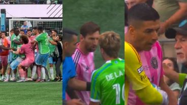Apenas se escuchó el pitazo final, Luis Suárez salió corriendo hacia la ubicación de Obed Vargas. Enseguida comenzó con una discusión, luego con empujones y agarrones y se fueron sumando Maxi Roldán y Marcelo Weigandt, entre otros.