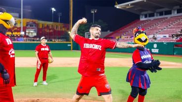 El futbolista de Newell's Ever Banega fue el encargado de lanzar la primera bola en el juego de la serie de béisbol entre El Águila de Veracruz y Piratas de Campeche, en la previa del cuadrangular amistoso denominado International Foorball Cup.