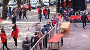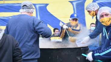 En las instalaciones del Gigante de Arroyito comenzaron a dar empanadas y locro sin costo y por orden de llegada desde las 11.30. Una larga fila bordeaba la parte de Génova y Avellaneda para buscar la comida. Se respetó el distanciamiento social y el uso del tapaboca.