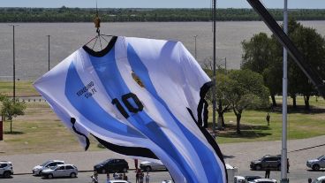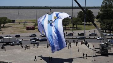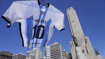 La enorme camiseta de Lionel Messi confeccionada en Serodino y trasladada en helicóptero a Rosario llegó al Monumento a la Bandera este viernes al mediodía en la previa del partido de Argentina con Francia este domingo en la Copa del Mundo. La casaca gigante quedará allí hasta las 17 y ya pasada la 1 había fila para la foto.