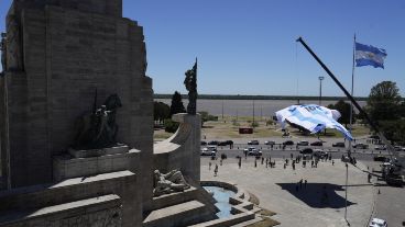 La idea de la casaca gigante fue del presidente comunal de Serodino, Juan Pío Drovetta quien este viernes estuvo en el Monumento para ver desplegada la camisdeta de 80 kilos.
