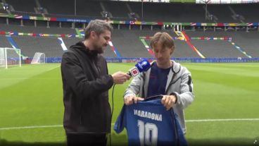El emblema del Real Madrid y la selección de Croacia, Luka Modric, fue entrevistado previo a lo que será el debut frente a España este sábado a la tarde. Como cierre de la nota, el cronista le regaló una camiseta de Diego Maradona, como las que usó en el Mundial de Estados Unidos 94 y el astro croata se sorprendió: "Es el más grande".