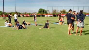 Maxi lució una remera negra con el símbolo de la marca deportiva que lo viste. El Gato formica entrenó de blanco. Nacho Scocco con un pantalón de su equipo de Hughes (del que es presidente). El Negro Domínguez lo hizo con un short gris y un buzo con capucha. Faci Quignon practicó con una bermuda que bien podría usar en una pileta o en la playa en las vacaciones.