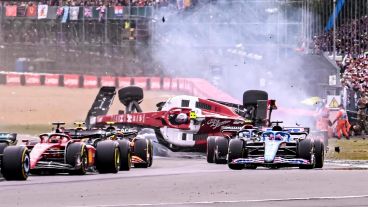 La largada del Gran Premio de Gran Bretaña de Fórmula 1 tuvo este domingo un impresionante accidente que involucró a cinco autos, aunque la peor parte se la llevé el chino Guanyu Zhou, que terminó volando por el aire y dado vuelta a bordo de su Alfa Romeo. El halo le salvó la vida.