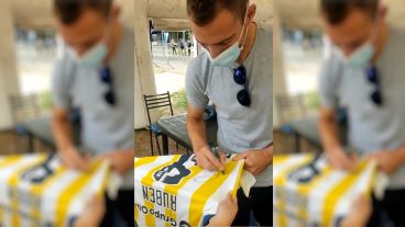 El goleador canalla obsequió la camiseta blanca a bastones amarillos que suele utilizar el equipo como indumentaria alternativa en la Liga Profesional de Fútbol. El “9” la firmó y se la dejó a los trabajadores y trabajadoras de la salud.