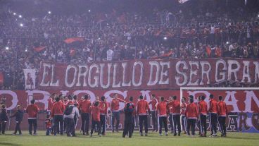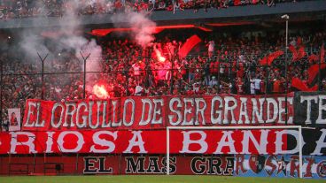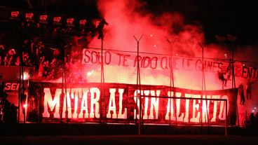 Las banderas “El más grande del interior” y “La gloriosa banda de rojinegro” eran algunas de las presentes detrás de arco, donde suele concentrarse el grueso de los hinchas que se juntan para apoyar al equipo y, en este caso, pedir un triunfo ante el clásico rival.