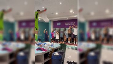 Scaloni con los brazos en alto en el medio, Dibu Martínez subido a la mesa de masajes, los demás jugadores cada uno en su espacio golpeando el piso con los botines. Así, se vivió la victoria albiceleste.